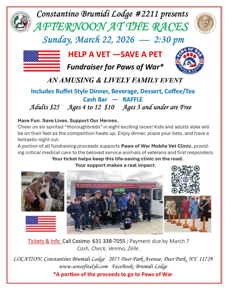 Welcome to the Constantino Brumidi Lodge Order Sons and Daughters of Italy in America. Located on Rte 231 in Deer Park, NY. Our lodge building / catering hall is conveniently located off the Long Island Expressway, Northern State Parkway, Southern State Parkway, and Sunrise Highway. We sponsor many functions and benefits throughout the year. Many of these functions are available to non members as well.