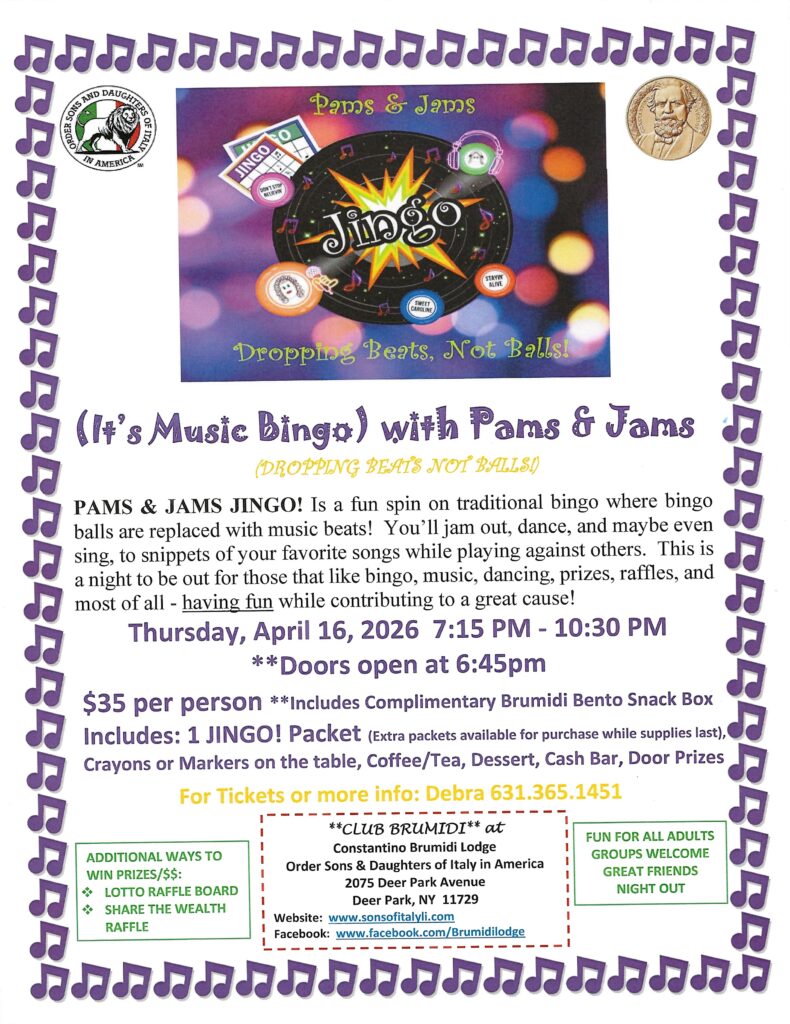 Welcome to the Constantino Brumidi Lodge Order Sons and Daughters of Italy in America. Located on Rte 231 in Deer Park, NY. Our lodge building / catering hall is conveniently located off the Long Island Expressway, Northern State Parkway, Southern State Parkway, and Sunrise Highway. We sponsor many functions and benefits throughout the year. Many of these functions are available to non members as well.